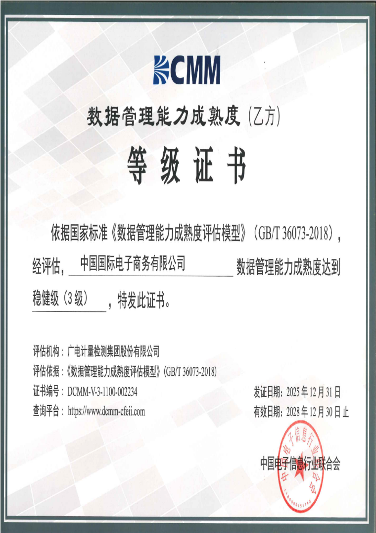 近日,依据国家标准《数据管理能力成熟度评估模型》(GB/T 36073-2018,简称DCMM),经中国电子信息行业联合会评定,中国国际电子商务有限公司成功通过国家数据管理能力成熟度稳健级(3级)认证。这标志着中心数据治理体系达到国家标准,数据管理能力正式迈入数据驱动的规范化发展阶段。