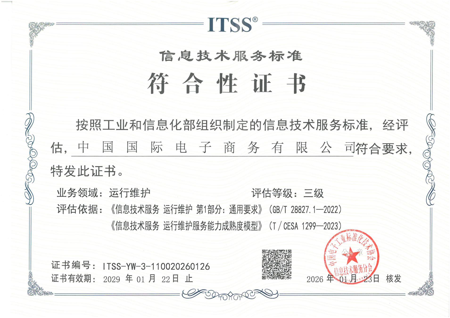 近日,中国国际电子商务有限公司(以下简称“商务公司”),顺利通过信息技术服务标准(ITSS)运行维护服务能力成熟度三级(拓展级)认证,这一成果标志着商务公司在信息技术服务领域的规范化和专业化管理水平迈上新台阶,服务交付、过程管理及技术支撑实力获得国家权威标准的充分认可。