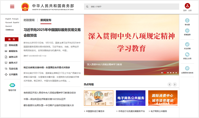 商务部网站在中国政府网站绩效评估中,连续23年位列部委级网站第一名。该网站采用“单位建站、网站组栏”的集约化建设模式,形成多语言版本,包括中文、英文、法语、俄语、德语和西班牙语。网站注重智能化、个性化及数据开放等创新应用,是商务部信息公开、政民互动、在线办事和公共服务的第一门户。